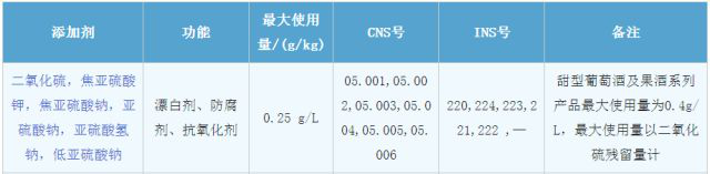 在我國,根據(jù)GB2760-2014規(guī)定,干型葡萄酒中二氧化硫及亞硫酸鹽的最大使用量不得超過250ml/L,甜葡萄酒不得超過400mg/L。