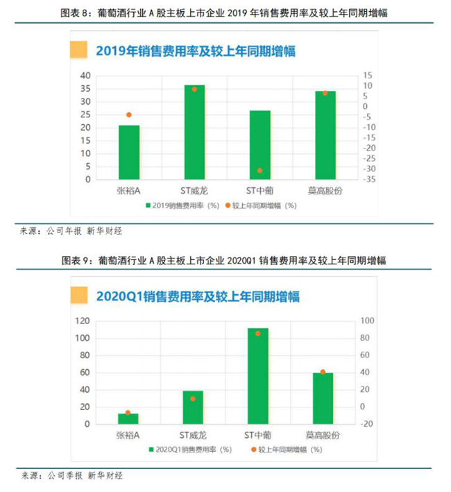 2020年第一季度,張裕銷售費用率顯著下降,為四家上市企業(yè)中最低,主要由于新冠肺炎疫情嚴重影響公司營銷活動減少。不僅僅是張裕,其他三家銷售費用均受疫情影響大幅下滑,所以其他三家高企的銷售費用率及增幅,并不是品牌和渠道建設(shè)上的大手筆投入增加,而是銷售費用的下滑幅度并沒有追上其營收的下滑幅度所致。