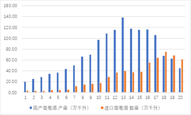 假如時光倒流20年,葡萄酒在中國也是稀罕物,是高端人士過上時尚生活的標志,雖然規模有限只有23.65萬千升,但國產葡萄酒有20.19萬千升,而進口葡萄酒只有3.46萬千升。20年后的今天,中國葡萄酒的市場規模達到92.1萬千升,國產葡萄酒產量為45.1萬千升,而進口葡萄酒的已經達到61.25萬千升。專業人士稱,這已經是進口葡萄酒連續三年超過國產葡萄酒了。