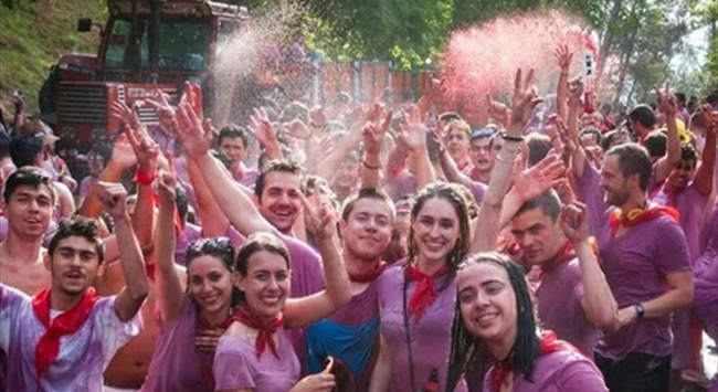 這一天,成百上千人會穿著白色衣服、系著紅色方巾,拿著水槍、噴霧器、水桶等可以裝著葡萄酒的容器作為“武器”,在街道上開始這場“戰爭”。最終他們將衣服染成紫色,“幸存者們”伴隨著音樂返回拉巴斯廣場,享用午餐(特色蝸牛)和美酒。