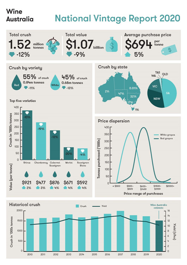 根據(jù)澳大利亞葡萄酒管理局在今天(7月7日)發(fā)布的2020年《全國釀酒葡萄收獲報(bào)告》(National Vintage Report)顯示,2020年澳大利亞的釀酒葡萄收成(壓榨)產(chǎn)量約152萬噸,相當(dāng)于超過10億升的葡萄酒。
