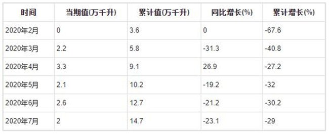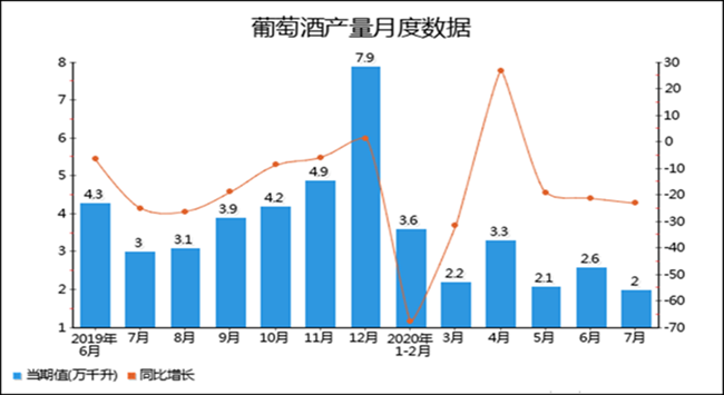 2020年7月全國(guó)葡萄酒產(chǎn)量為2萬(wàn)千升,累計(jì)值為14.7萬(wàn)千升,同比下降23.1%,累計(jì)下降29%。