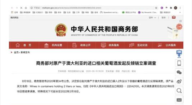 首先是中國對澳大利亞葡萄酒展開為期幾個月的反傾銷調查,一旦傾銷被認證,中國可能對澳大利亞葡萄酒加征懲罰性關稅,關稅可能為商品價格的202.7%。