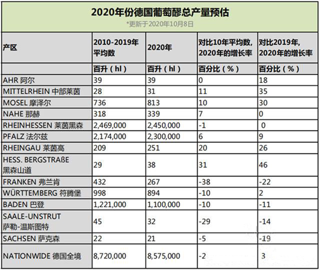 在德國全境范圍內(nèi),目前預計2020年的總產(chǎn)量約為8.6億升,接近10年來平均8.7億升的總產(chǎn)量,將比2019年的總產(chǎn)量高出3%。