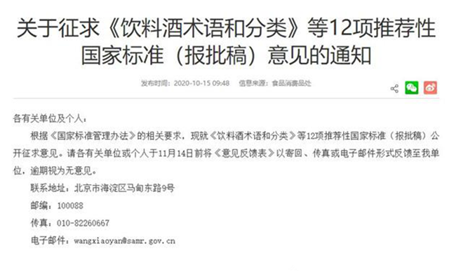 日前,國家市場監(jiān)督管理總局發(fā)布了“關(guān)于征求《飲料酒術(shù)語和分類》等12項推薦性國家標準(報批稿)意見的通知”,根據(jù)《國家標準管理辦法》的相關(guān)規(guī)定,《飲料酒術(shù)語和分類》等12項推薦性國家標準已完成報批稿,涉及釀酒、鹽業(yè)、白酒等標準化技術(shù)委員會。