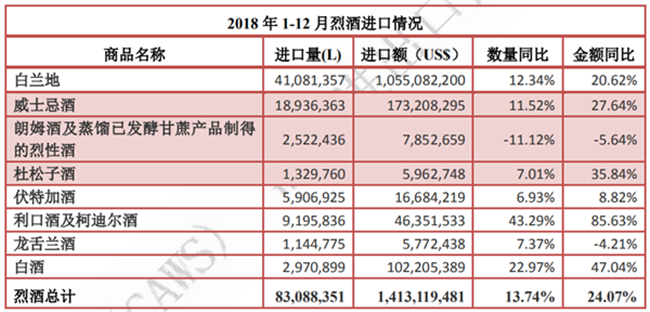 (1)白蘭地進口額增至 10.6 億美元,同比增幅為 20.6%,占烈