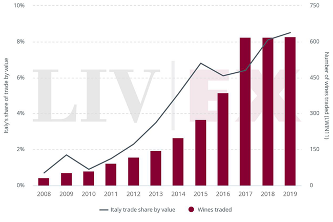 隨著更多意大利葡萄酒供應(yīng),使該酒區(qū)的交易價(jià)值和數(shù)量也同在增加。事實(shí)上,現(xiàn)在意大利只僅次于波爾多和勃艮第,已成為第三大活躍酒區(qū),其交易總值份額已由2010年時(shí)的不到2%攀升至本年迄今的8.5%;這使葡萄酒生產(chǎn)商、國(guó)際酒商和收藏家人人受益。