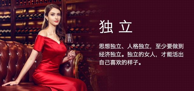 一、獨(dú)立:獨(dú)立的女性總是那么的吸引人,獨(dú)立的女性能夠活出自己的風(fēng)采,思想上的獨(dú)立和人格上的獨(dú)立造就了女性不同的魅力,讓人心生愛(ài)慕。如同紅酒,每一款都有著其獨(dú)特的香氣,讓紅酒愛(ài)好者迷醉其中。