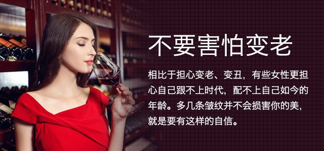 七、不要害怕變老:時(shí)間會(huì)改變?nèi)蓊仯咸丫埔矔?huì)隨著時(shí)間的流逝而改變其本身瑰麗的色澤。每一位女性就像一瓶瓶具有陳年價(jià)值的紅酒,在最初釀制的酸澀,如女性青春年少的清新自然;而后陳年到最佳適飲年份,這時(shí)候的紅酒就像到了最具女性魅力的黃金年華,端莊優(yōu)雅;再隨后這瓶葡萄酒陳年變成了老酒,這時(shí)候的葡萄酒雖然過(guò)了最佳適飲年份,風(fēng)味卻更加的復(fù)雜,不少紅酒愛(ài)好者都不遺余力的追逐這些陳年老酒。而這時(shí)候的女性因?yàn)闀r(shí)間、閱歷的沉淀,沒(méi)有了青澀,卻更加大氣,貴氣自生。