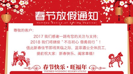 尊敬的藍菲代理商朋友們: 新年的鐘聲即將敲響,根據國家春節假期通知及藍菲公司的實際情況, 確定于2018年2月9日-2月22日,共14天,為藍菲酒業春節假期,于2018年2月23日(正月初八)正式上班,請好朋友們悉知。 同時在此提前恭祝,新春快樂! 2017年是非同尋...